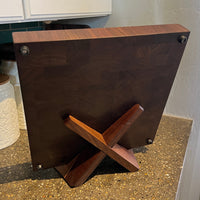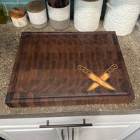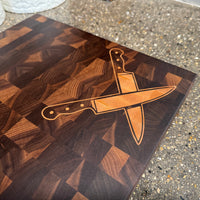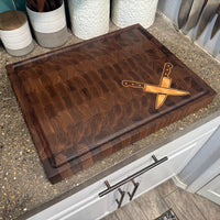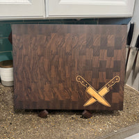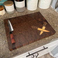 Beautiful Custom Black Walnut End Grain Cutting Boards with a Maple Crossed Knife inlay.
